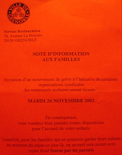 Because of a strike initiated by certain unions, the school cafeterias will be closed on Tuesday, November 26, 2002. As a result, you should make plans to feed your children at home on that day. Of course, for those families who can not take care of their children during the noon meal, a cold lunch furnished by the parents may be eaten at school.